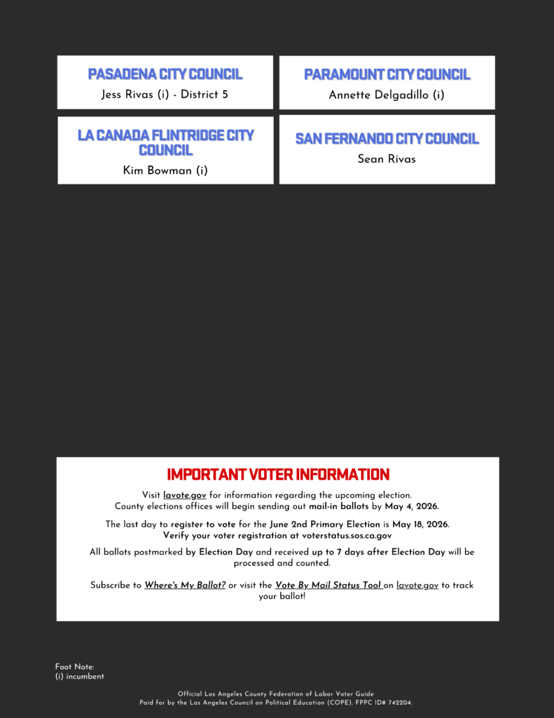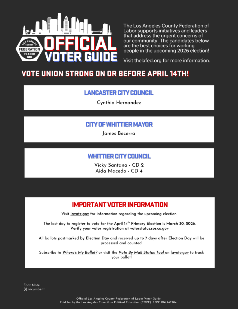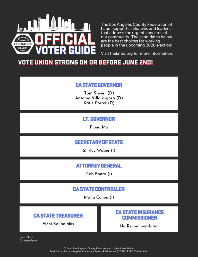 The Los Angeles County Federation of Labor supports initiatives and leaders that address the urgent concerns of our community. The candidates below are the best choices for working people in the upcoming 2026 election!